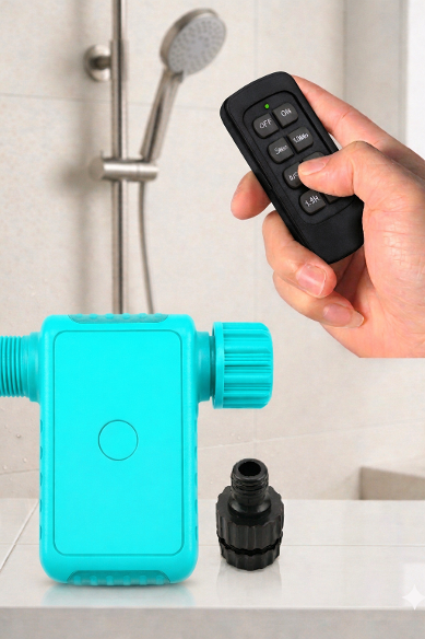 RemoteShowerTimer is a remote-controlled automatic shower shutoff device that physically stops water flow when the timer expires — no plumbing required, universal fit for any bathroom pipe.